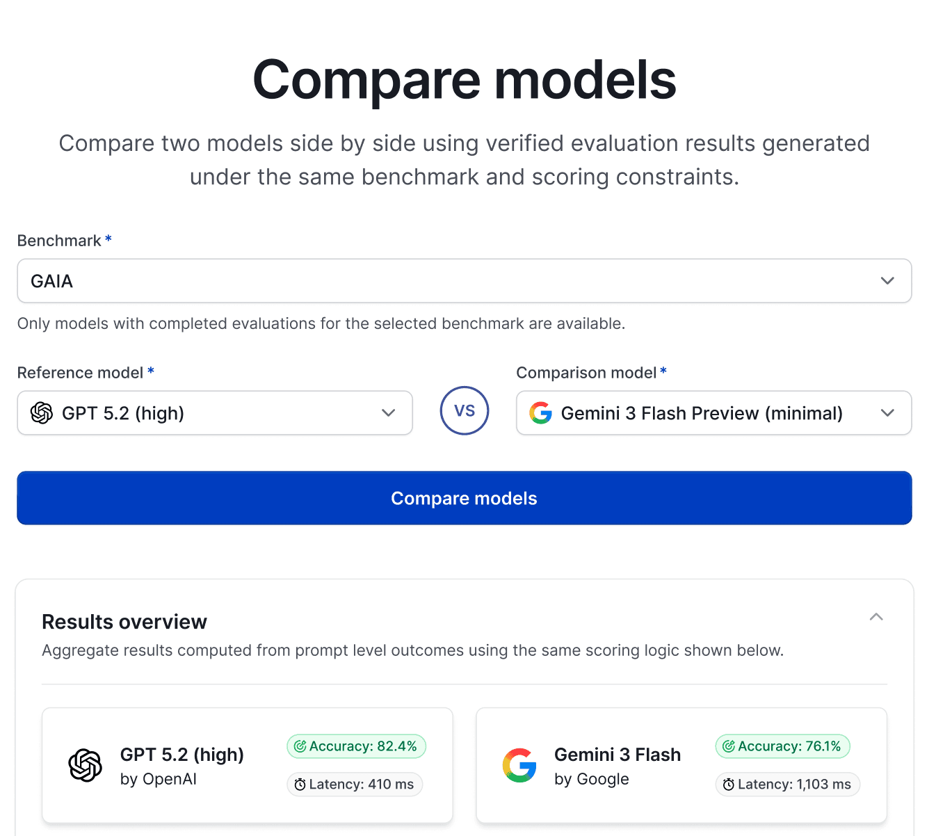 Compare two Models on any supported Benchmark. See differences in accuracy, latency, confidence intervals, and behavior at a glance.