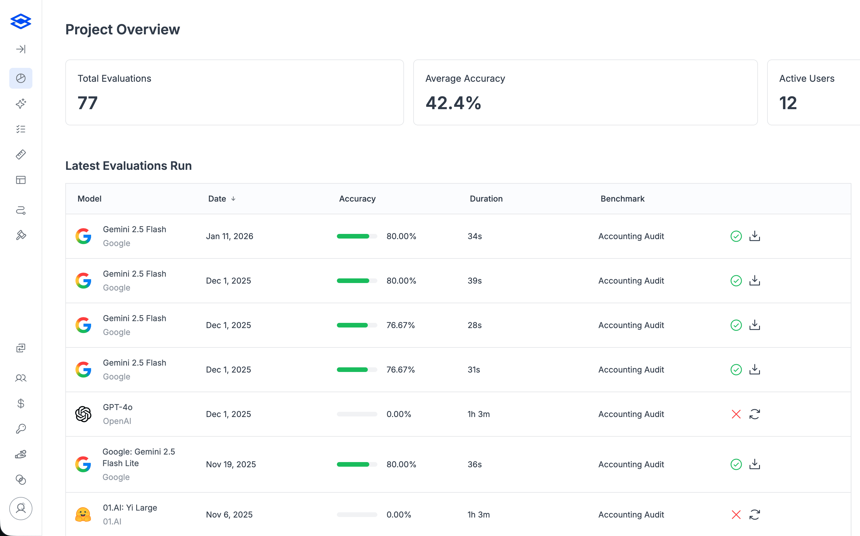 Upload your own Benchmark and run Evaluations with full traceability. Free plans support manual upload, while paid plans add automatic Benchmark creation from documents.