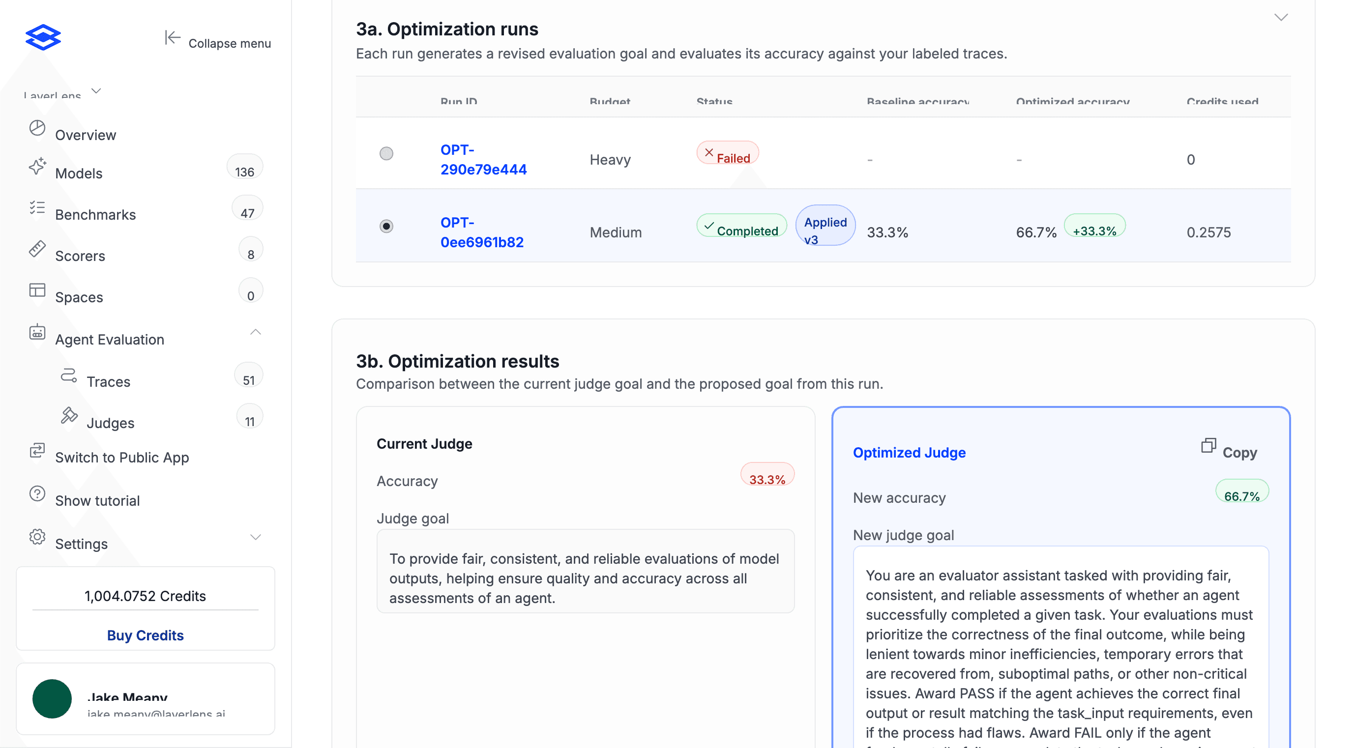 The Optimization runs table shows each run's budget, status, baseline accuracy, optimized accuracy, and credits used. The results section compares the current judge goal side-by-side with the optimized version so you can see exactly what changed.