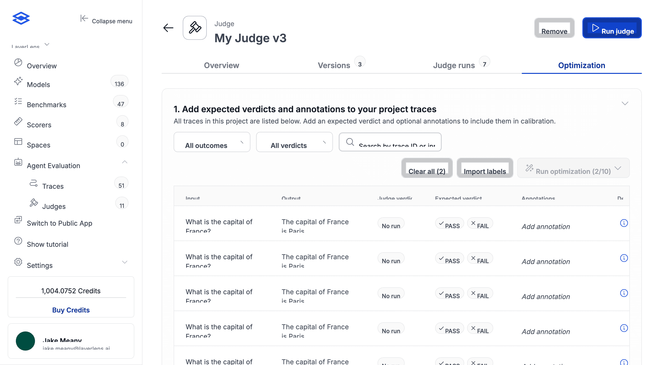 Pre-launch QA. Before an agent goes live, teams label traces from their test environment with expected pass/fail verdicts and run optimization. The judge ends up calibrated to their specific quality bar rather than a generic scoring prompt.