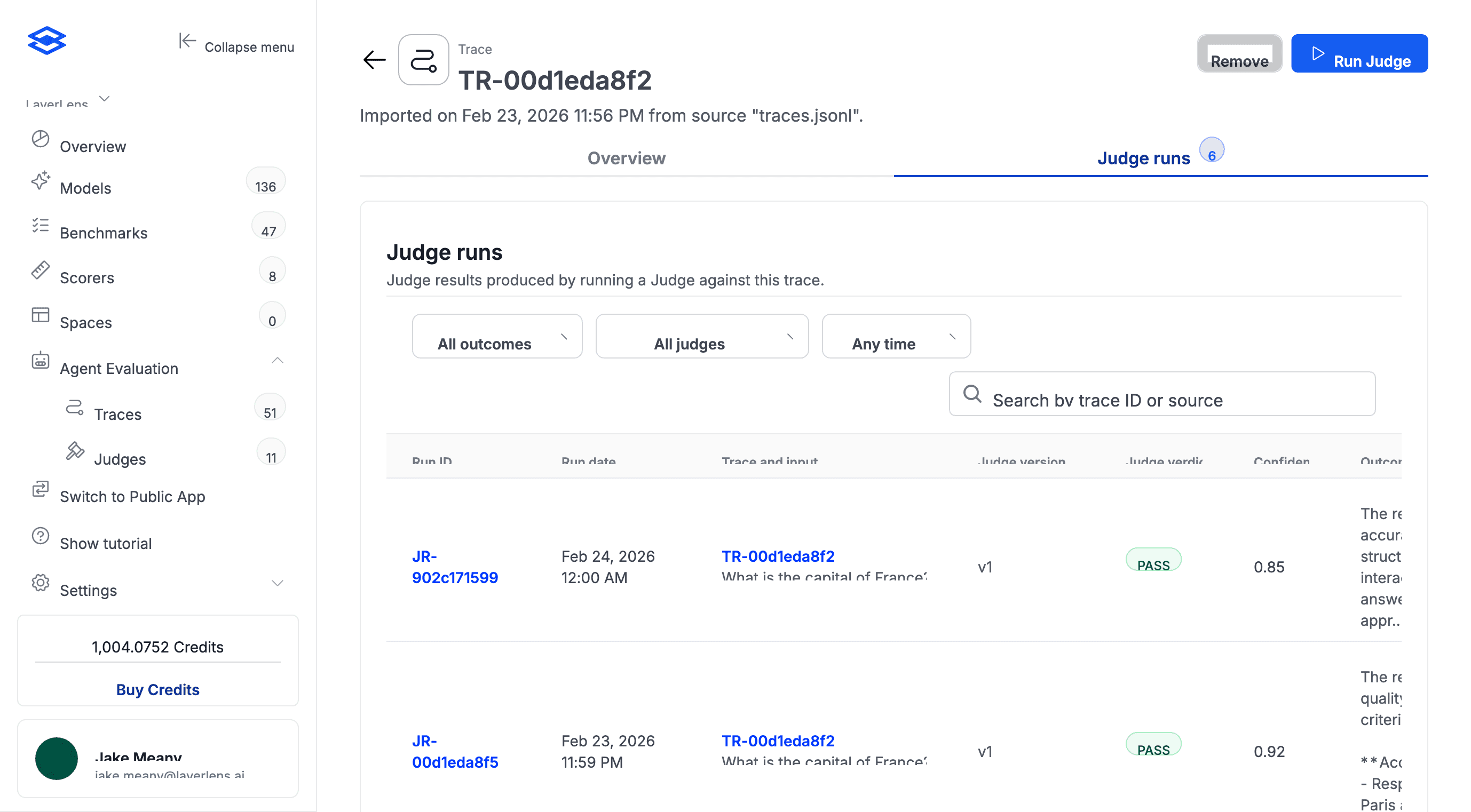 The judge has already scored these. Some verdicts won't align with your team's expectations. Open any trace to see its judge runs and compare automated scores against what your team expects.