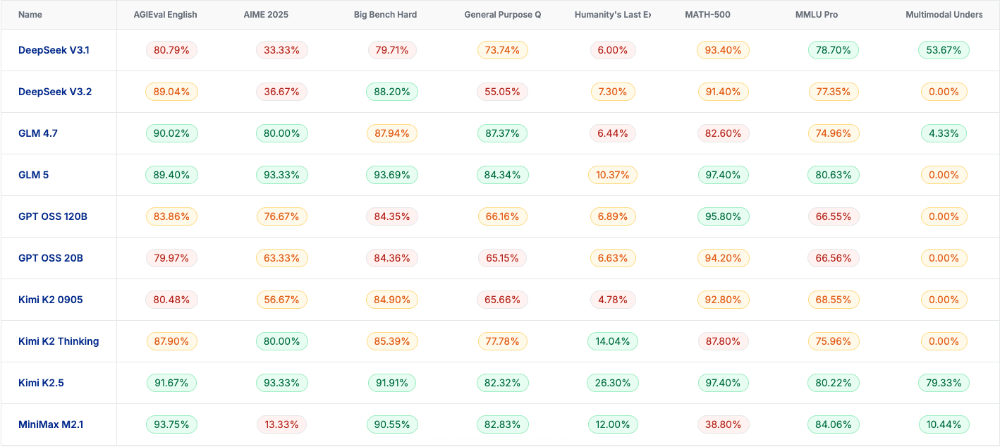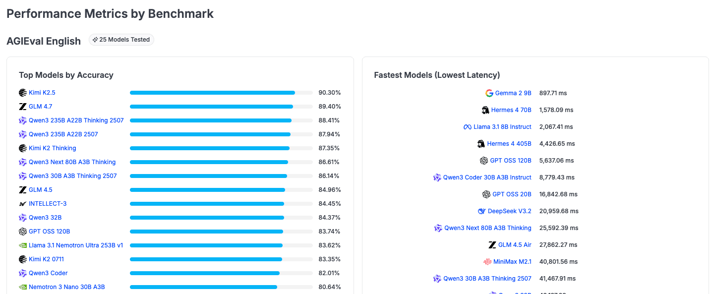 On AGIEval English (one of the 8 benchmarks), the accuracy spread runs from MiniMax M2.1 at 93.75% down to GPT OSS 20B at 79.97%. On the latency side, DeepSeek V3.1 is the fastest at 6,212ms, while Kimi K2 Thinking is the slowest at 390,762ms on the same benchmark. That is a 63x difference in response time between the fastest and slowest model on a single benchmark, all on the same provider's infrastructure.