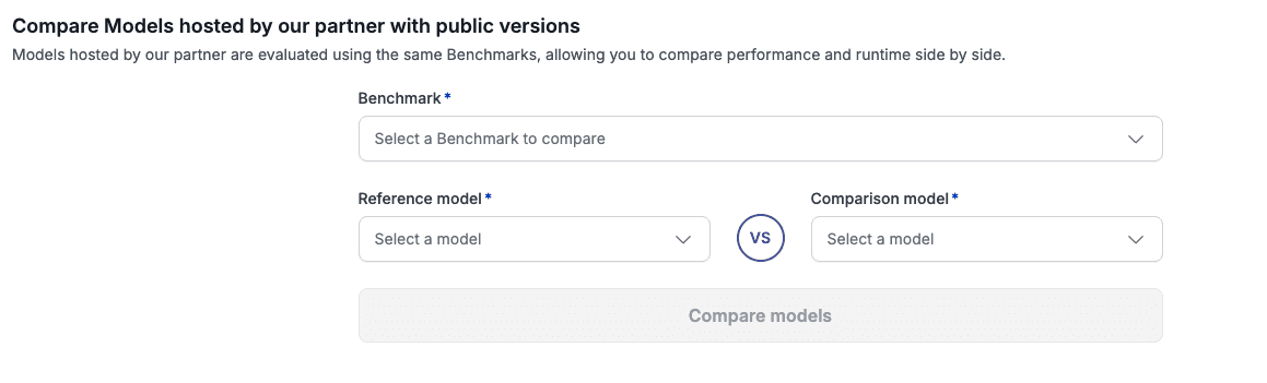 A built-in comparison tool lets you evaluate partner-hosted model versions against public versions of the same model, same benchmark, side by side (accuracy and runtime).