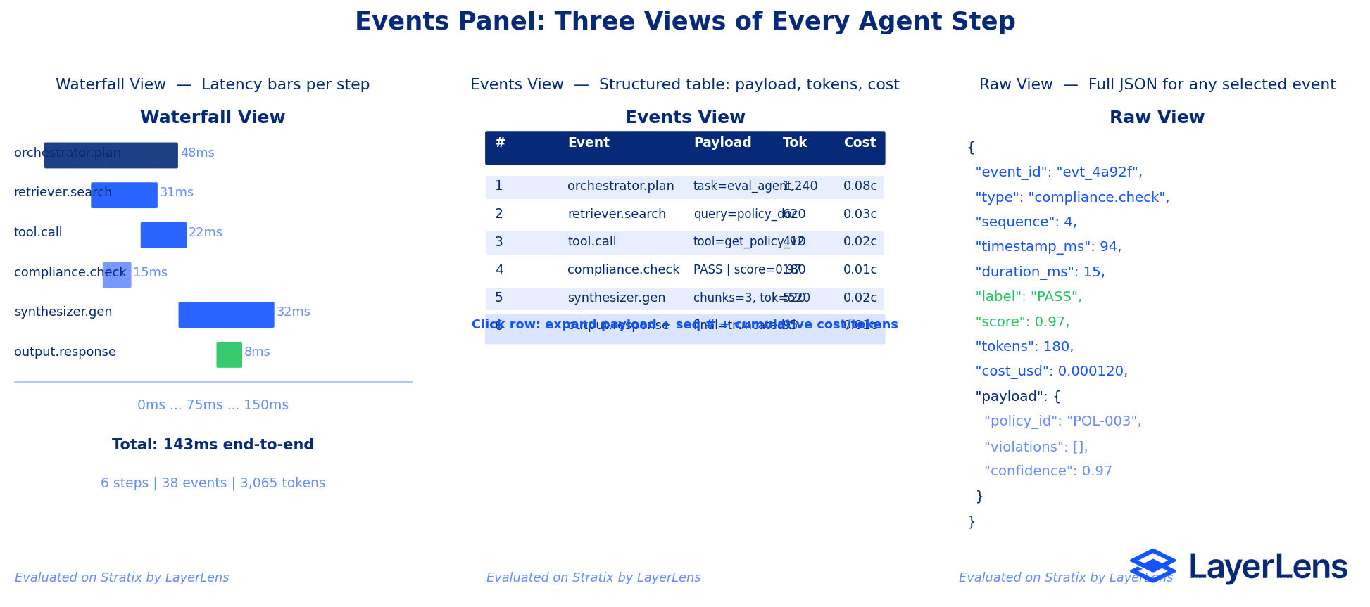 The Events panel replaces the need to export raw event logs for inspection. Three views cover the three most common diagnostic questions: latency, correctness, and raw context.