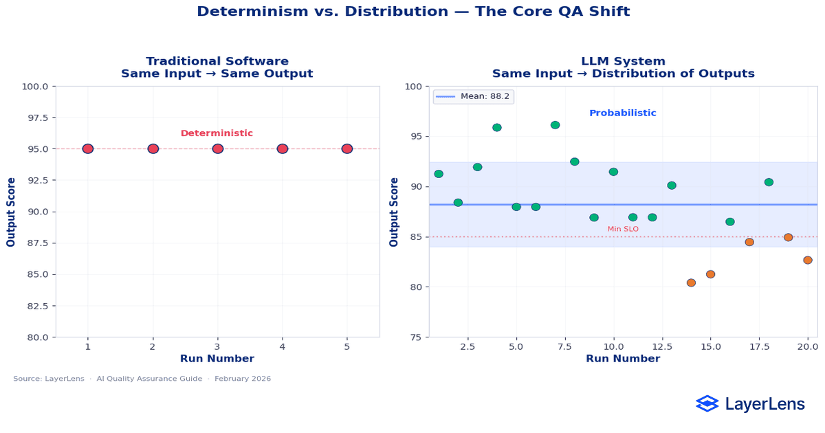 Traditional QA assumes identical input produces identical output. LLM systems generate distributions of outputs that require tolerance-based evaluation and continuous monitoring.