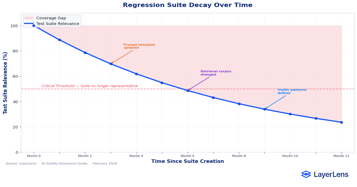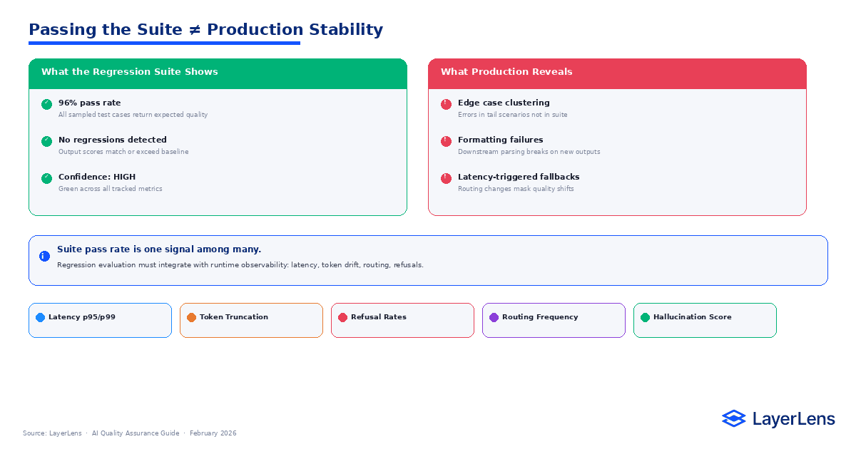 Deterministic assertions do not capture distributional behavior. Regression suites decay as traffic evolves. Passing tests does not guarantee stability.