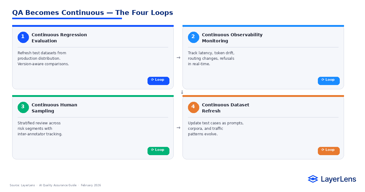 AI quality assurance for LLM systems requires statistical evaluation, runtime observability, structured human sampling, and threshold-based release management.