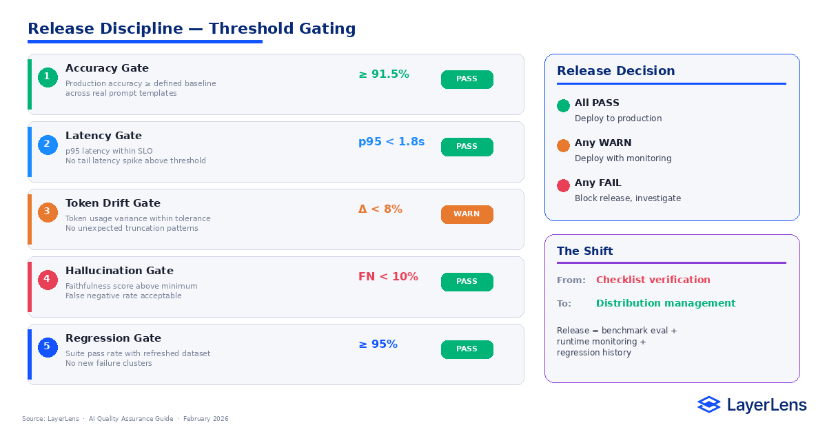 Release management uses threshold-based gating across accuracy, latency, token drift, hallucination risk, and routing stability rather than binary pass/fail validation.
