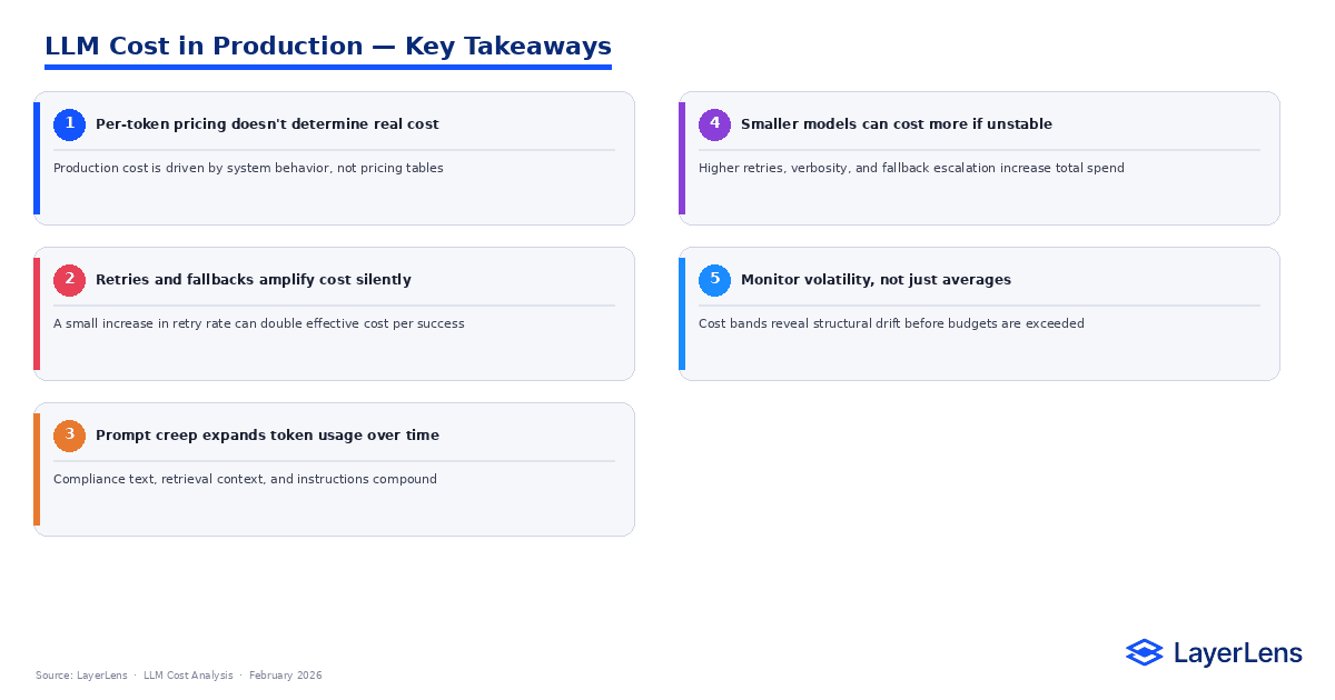LLM cost in production is driven by token usage growth, retry frequency, routing fallback behavior, output verbosity drift, and traffic composition changes. Pricing per 1K tokens is only one variable in a much larger system dynamic.