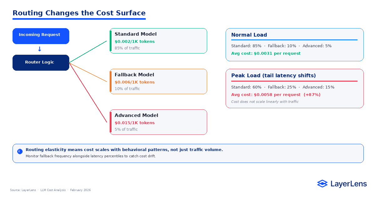 Retry amplification and routing elasticity reshape effective cost per successful output.