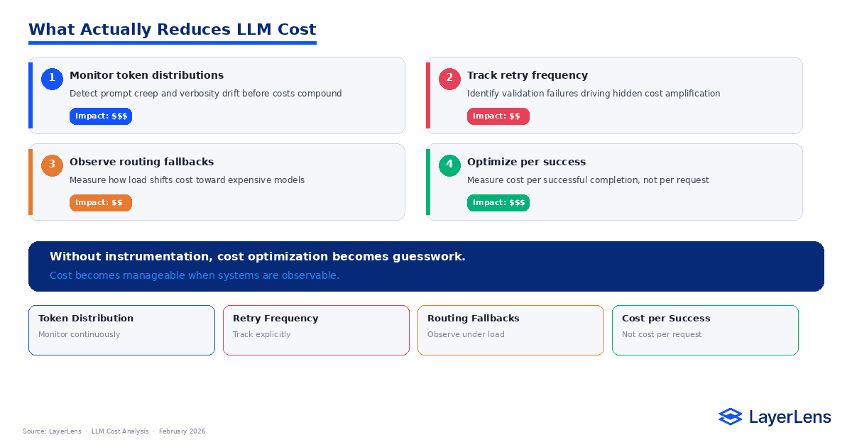 Teams reduce LLM costs by monitoring token distribution, retry frequency, routing ratios, and regression trends. Addressing root behavioral drivers is more effective than switching providers based solely on pricing comparisons.