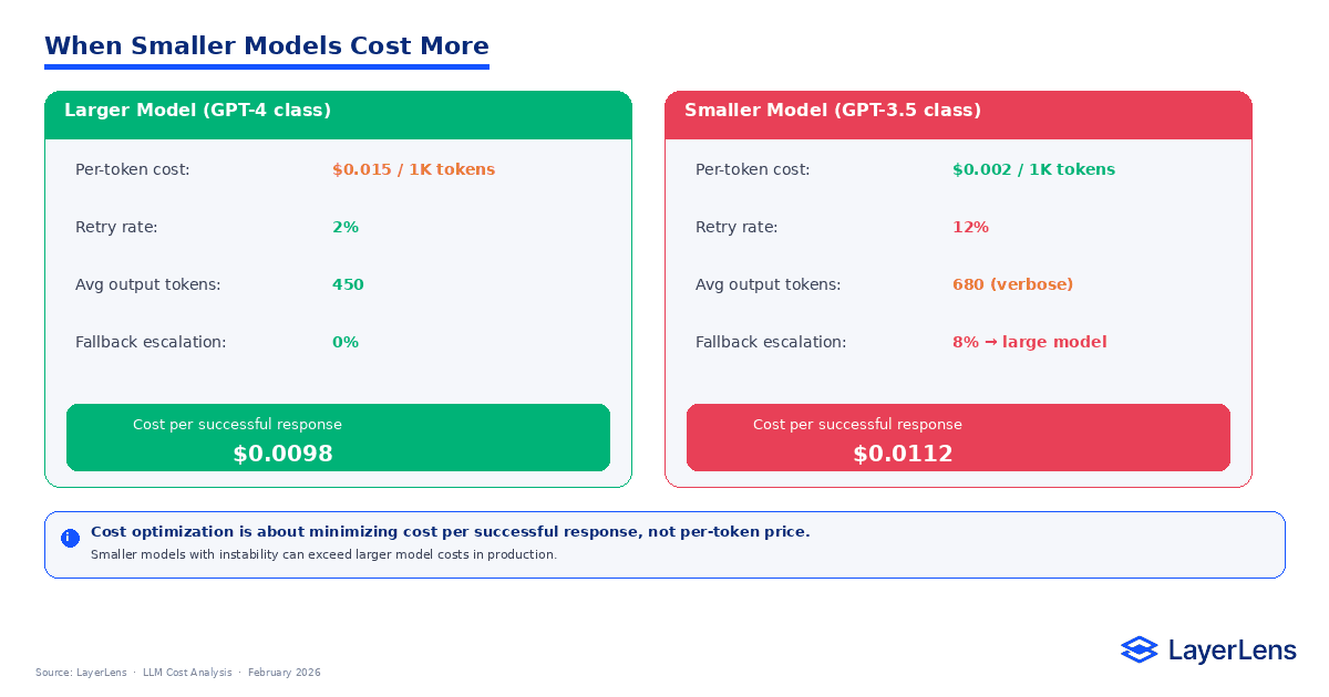 Smaller models can cost more when instability increases retry rates, verbosity expands output tokens, or fallback escalation shifts traffic to higher-cost models. Operational stability often matters more than nominal per-token pricing.