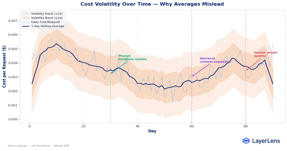 Prompt updates alter token distribution. Traffic gradually skews toward more complex queries. Vendor model updates change verbosity or reasoning patterns without explicit announcements.