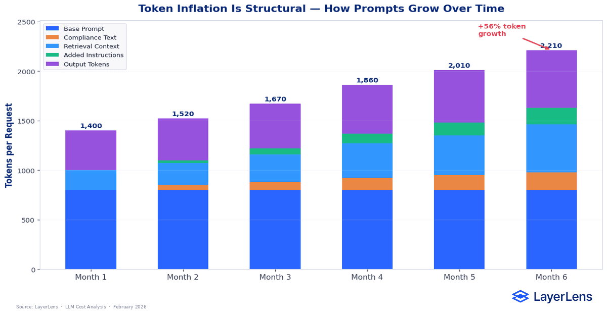 A compliance disclaimer adds 80 tokens. A formatting requirement adds 40. Retrieval expands from three documents to five. A safety revision inserts more guardrail language. Each change looks small in isolation.