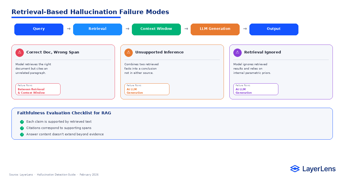 Common in retrieval systems. The answer is grounded in retrieved material, but the cited sentence does not support the claim. For retrieval-grounded evaluation details, see RAG evaluation in production (https://layerlens.ai/blog/rag-evaluation).