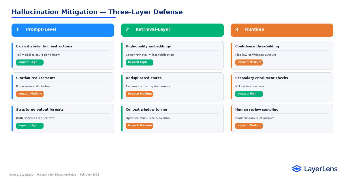 AI hallucination mitigation should combine these layers rather than relying on a single method.